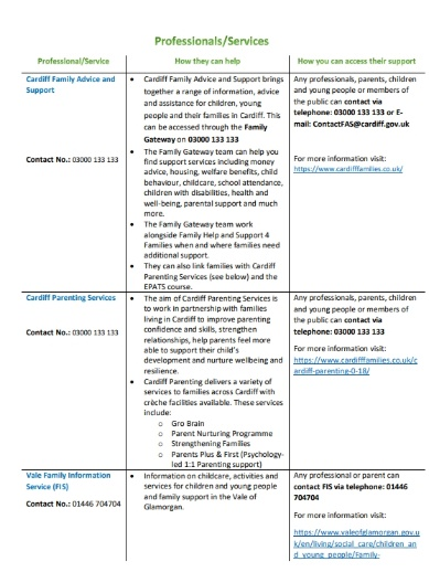 We have compiled a list of services and support available in the Cardiff and Vale area.